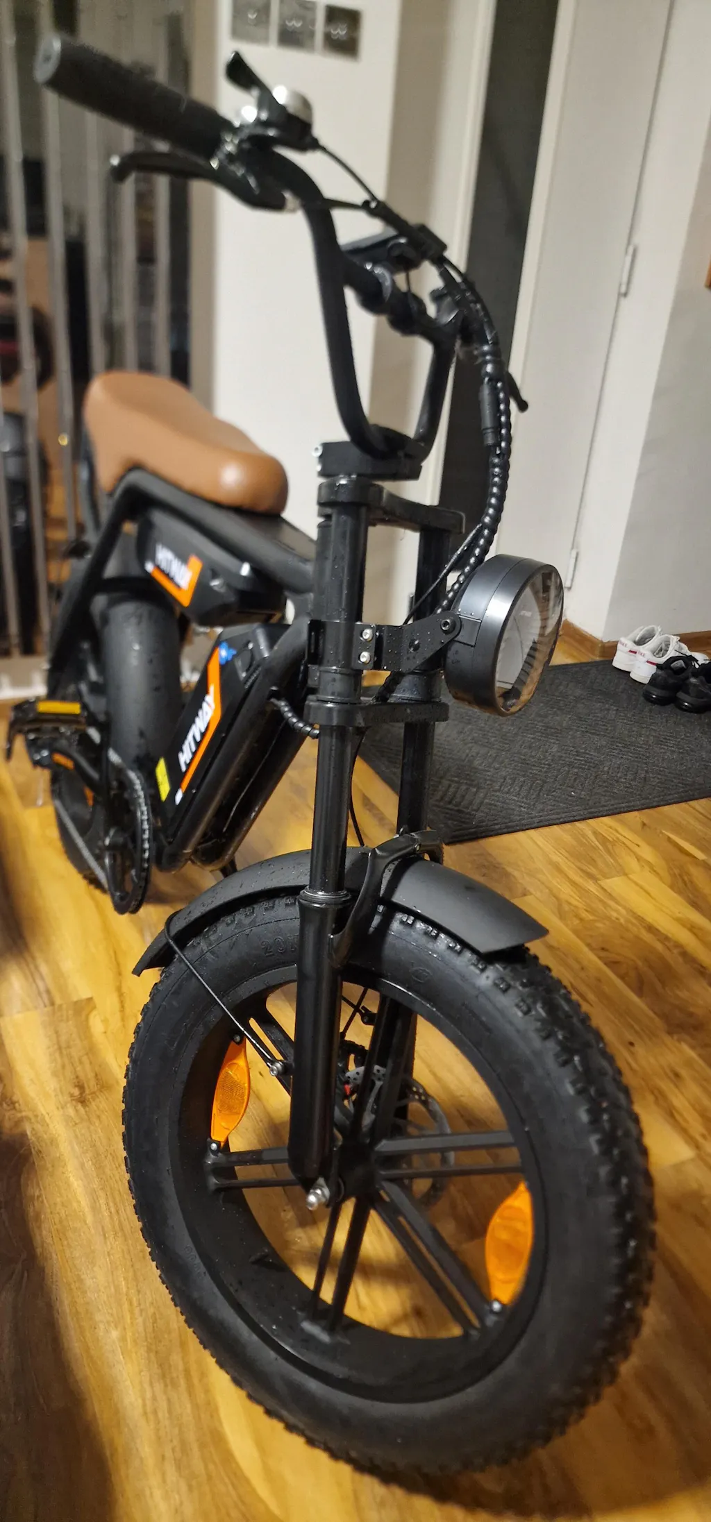 This front light is designed to enhance your safety and visibility while riding, especially in low-light or night-time conditions. The light can be easily activated by powering on your e-bike and pressing and holding the "+" button, which turns on both the front and rear lights simultaneously.
